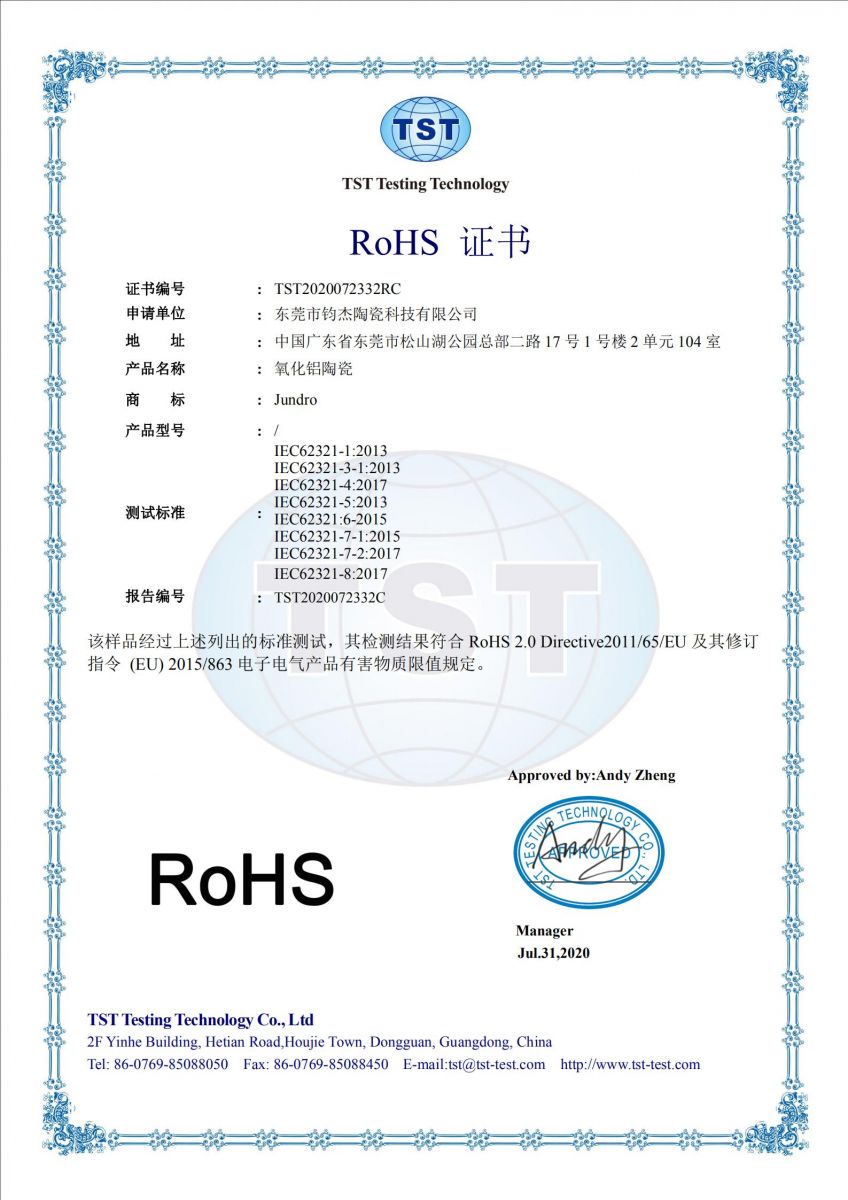 鈞杰陶瓷是一家專業(yè)從事氧化鋁陶瓷生產(chǎn)及加工的企業(yè),我們十分注重產(chǎn)品品質(zhì),無論是加工精度還是環(huán)保要求,我們都嚴(yán)格把關(guān)。目前我們的氧化鋁陶瓷已通過ROHS認(rèn)證。